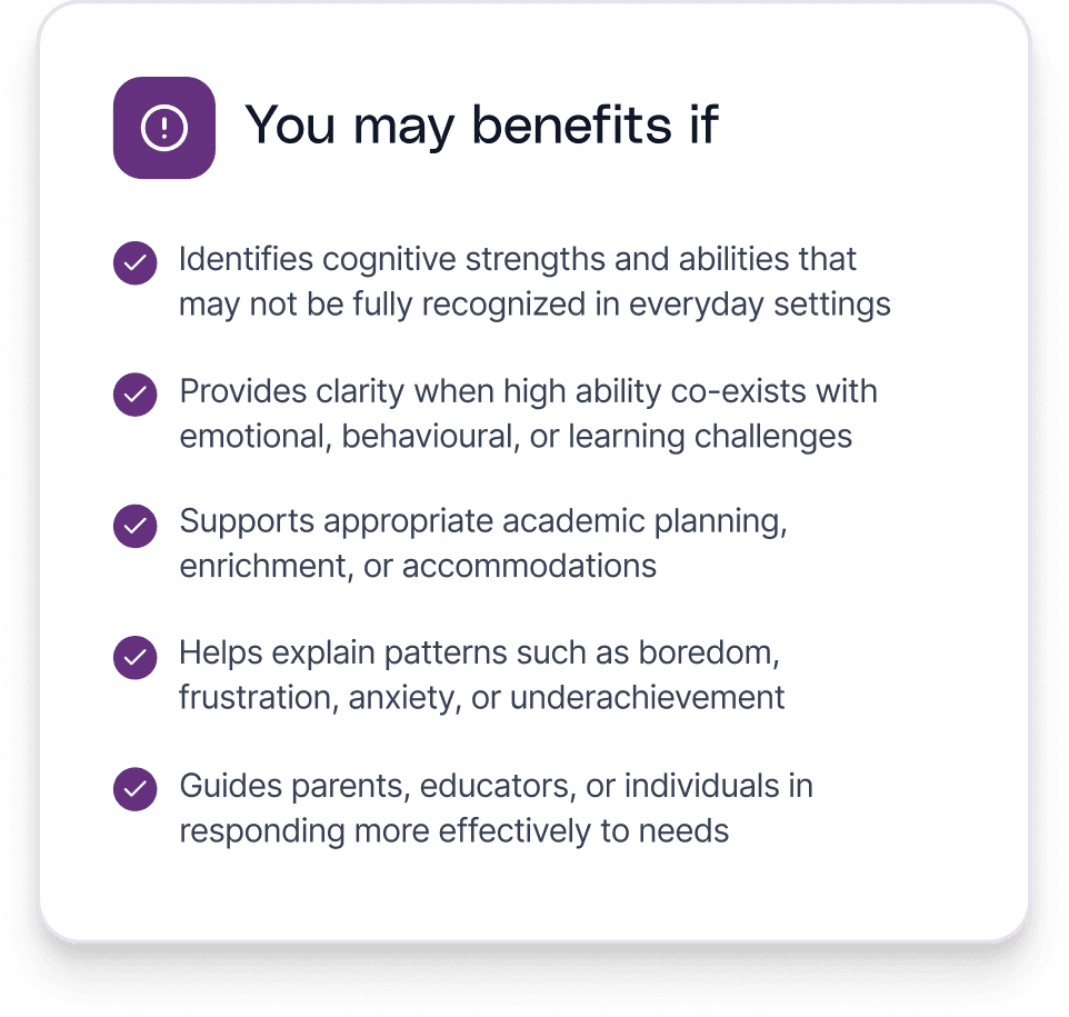 A gifted assessment may be helpful for children, adolescents, or adults who show advanced abilities but also experience challenges that aren’t well understood or supported. It helps clarify cognitive strengths, learning styles, and emotional needs, ensuring abilities are recognized while supports are appropriately tailored.
